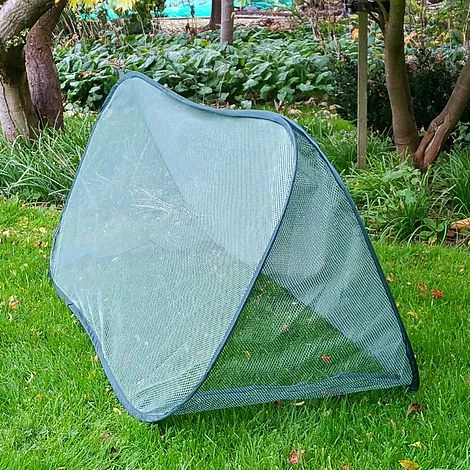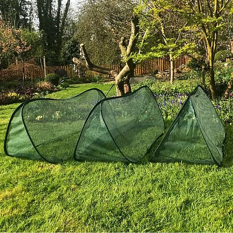 Get instant plant and crop protection with this pop up mini grow tunnel and veg bed cover. This triangular shaped plant cloche assembles in seconds – simply pop out the bag, pop up and peg down! The high-grade 4mm mesh netting protects against a variety of garden pests including birds, cabbage white butterflies, rodents and large insects. Letting light, air and moisture in, it also offers an optimised microclimate for healthy plants and edibles. Ideal for small grow beds and urban gardens, these beauties can also be popped on raised beds and planters for hassle-free protection for strawberries, salads, herbs and other crops. Comes with securing ground pegs and storage bag.