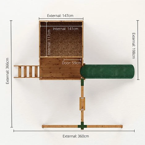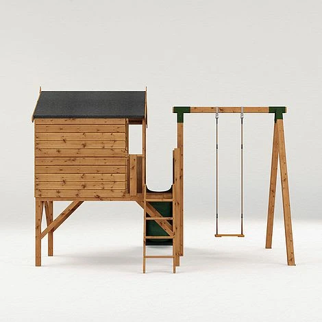 This playhouse with tower and activity set, is both a charming and traditional playhouse with a tower, slide and swing set. Somewhere your children can play and explore their imagination for hours, while spending time in the garden. Featuring a minimum 12mm finger gap around the door, rounded timbers and ventilation holes, our playhouses are EN71 certified and UKCA Marked. Made in the UK, using ethically sourced, FSC? certified timber, this playhouse is constructed using quality materials to ensure a strong and weatherproof build. The walls of this playhouse are constructed using premium horizontal interlocking tongue and groove boards with a shiplap profile. The shiplap profile includes a protective and aesthetically pleasing lip to create a strong, weatherproof panel. Complete with thick wooden framing to support the cladding internally, this building offers a rigid and long-lasting structure. Solid sheet board is used to form the floor and roof, a durable material that is made up of several layers of tightly compacted oriented strands. Solid sheet board is perfect for everyday general use. Robust roofing felt, fixtures and fittings are all supplied as standard, alongside our detailed instructions and our manufacturers recommendations, to ensure a simple and stress free assembly process. All of our buildings come with an Anti-rot guarantee, to ensure your garden building looks great and lasts the test of time, this building in particular comes with a conditional 10 year Anti-rot guarantee as well as a 12 month manufacturers warranty. Annual re-treatment is required to maintain your building and the Anti-rot guarantee. Suitable for children aged 36 months